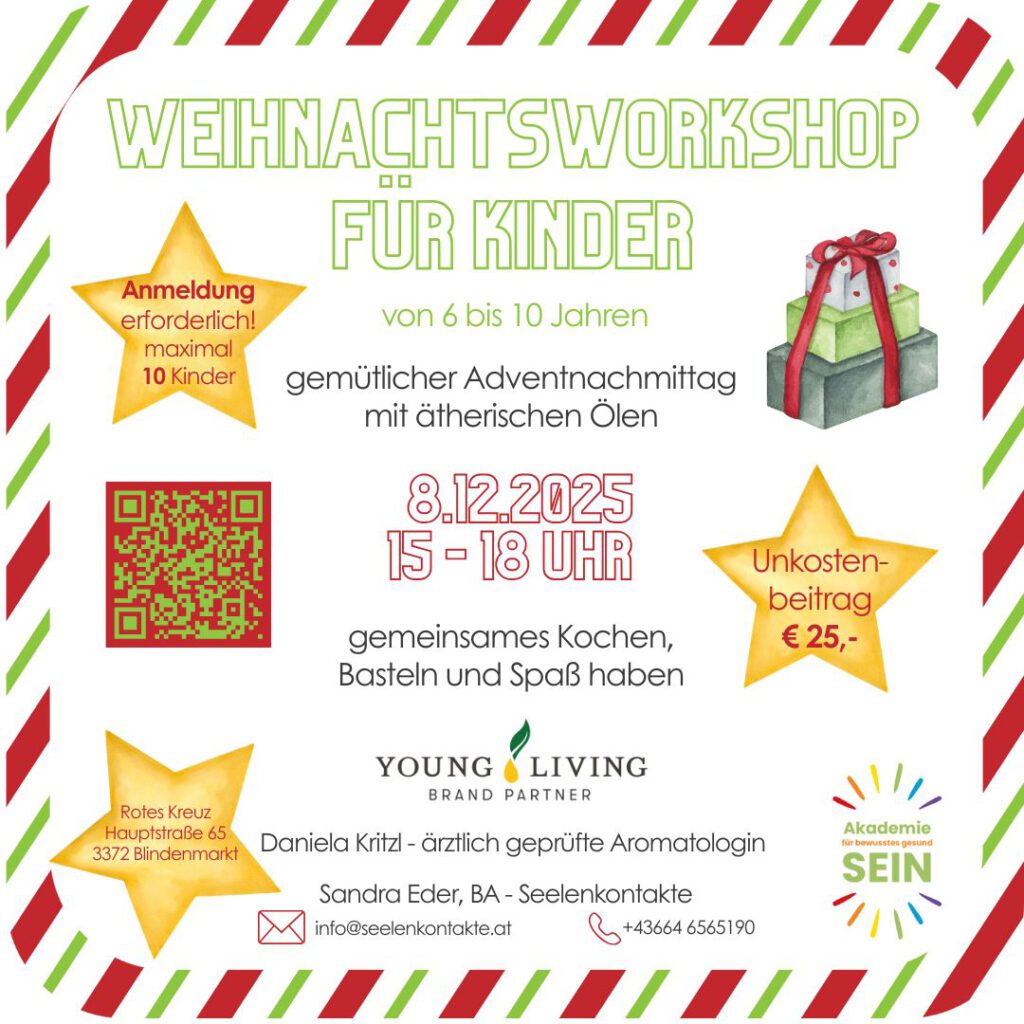 Verbringe mit uns einen gemütlichen Adventnachmittag mit ätherischen Ölen. Wir werden gemeinsam Kochen, Basteln und Spaß haben.